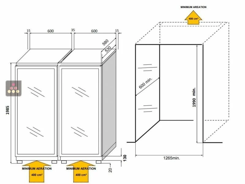Equipé d’un système de ventilation spécifique, ce modèle peut être placé dans une niche fermée sur les côtés et l’arrière. Un espace de ventilation doit être préservé en partie haute pour assurer l’évacuation de la chaleur de la cave (voir Schéma d’encastrement).