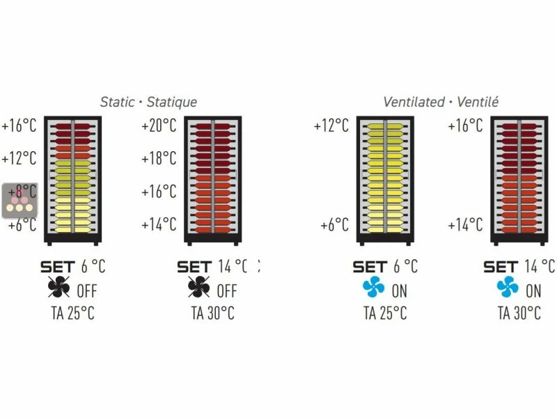 – soit en multi-usages service et conservation pour tous types de vins : la température sera alors croissante de 4 à 16°C sur toute la hauteur : 4-8°C pour le service des Champagnes, 8-12°C pour le service des vins blancs et rosés, 12-14°C pour la conservation des vins et 14-16°C pour le service des vins rouges.