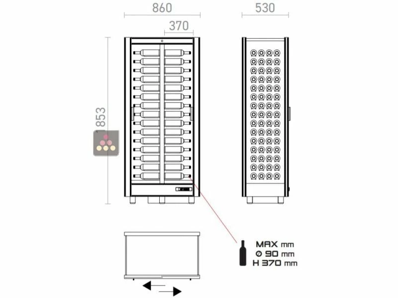 Présentation horizontale : ce modèle peut accueillir jusqu’à 240 bouteilles, couchées sur des tubes en aluminium, dans le sens de la largeur, ce qui laisse apparaître l’étiquette de la bouteille placée à l’avant. Au total, 60 bouteilles sont exposées avec l’étiquette visible. Le diamètre maximum des bouteilles est de 90mm, ce qui permet d’accueillir la plupart des formats 75cl standard (Bordeaux, Bourgogne, Champagne).