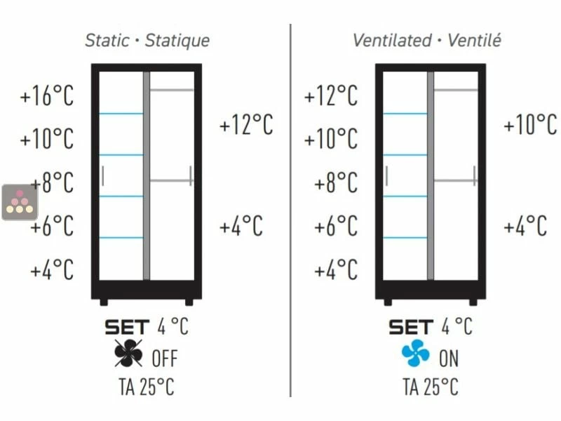 – soit en multi-usages service et conservation pour tous types de vins : la température sera alors croissante de 4 à 16°C sur toute la hauteur : 4-8°C pour le service des Champagnes, 8-12°C pour le service des vins blancs et rosés, 12-14°C pour la conservation des vins et 14-16°C pour le service des vins rouges.