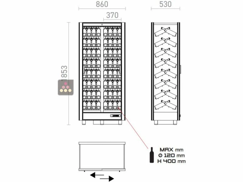 Présentation inclinée : cette vitrine peut accueillir jusqu’à 224 bouteilles, inclinées sur des tubes en aluminium, dont 128 sont inclinées vers l’avant étiquette visible, et 96 sont inclinées vers l’arrière, non-visibles mais accessibles. Le diamètre maximum des bouteilles est de 120mm, ce qui permet d’accueillir la plupart des formats 75cl et magnum de toutes les régions (Bordeaux, Bourgogne, Champagne).