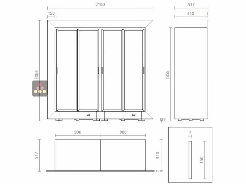 Installation : ces vitrines sont destinĂ©es Ă ĂȘtre installĂ©es encastrĂ©es pour s’intĂ©grer parfaitement Ă votre piĂšce. Elle peuvent ĂȘtre installĂ©es au sol, ou bien surĂ©levĂ©es sur un socle suffisamment solide (poids total avec bouteilles = 550kg). Pour son bon fonctionnement, lâespace situĂ© au niveau des pieds doit rester entiĂšrement libre.