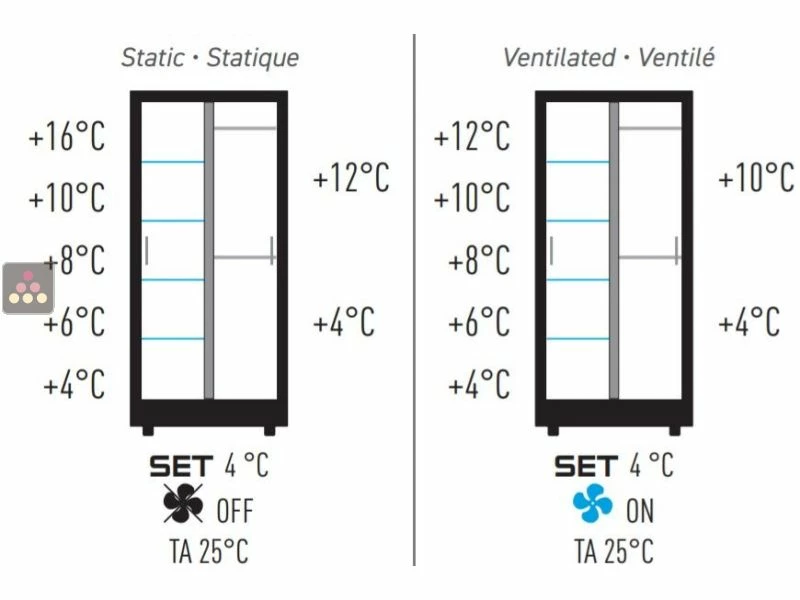 Technique : cette vitrine est équipée d’une production de froid brassée et d’une régulation de température étagée. En fonction de la ventilation interne (active ou non) et de l’équipement intérieur (étagères ou barres), le différentiel de température est compris entre 6°C et 12°C entre le bas et le haut de la vitrine, ce qui vous permettra d’organiser vos produits en fonction de leur température de dégustation.