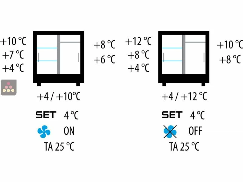 Technique : cette vitrine est équipée d’une production de froid brassée et d’une régulation de température étagée. En fonction de la ventilation interne (active ou non) et de l’équipement intérieur (étagères ou barres), le différentiel de température est compris entre 6°C et 12°C entre le bas et le haut de la vitrine, ce qui vous permettra d’organiser vos produits en fonction de leur température de dégustation.