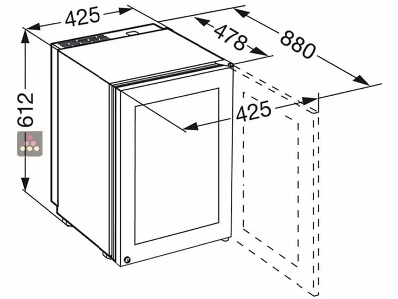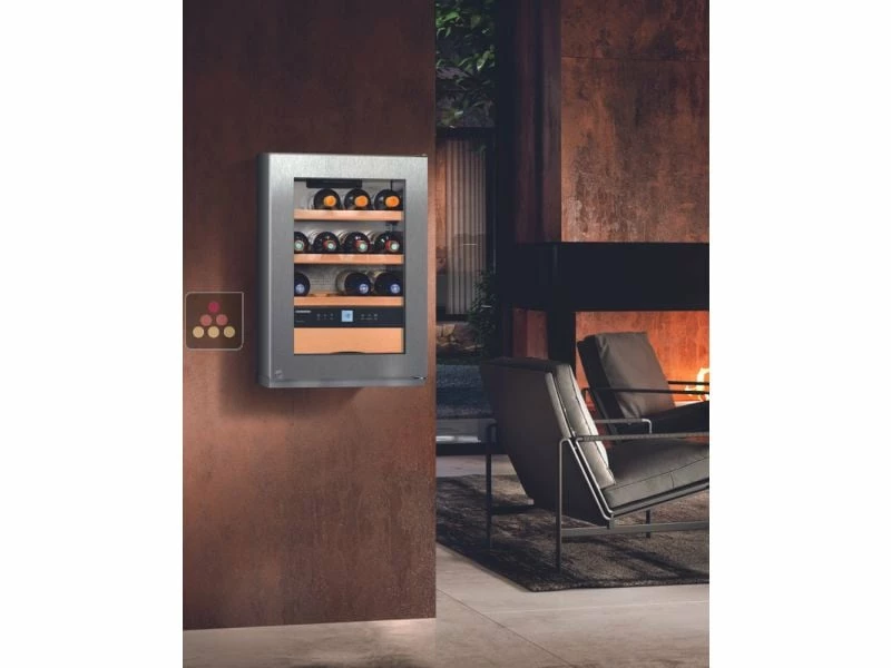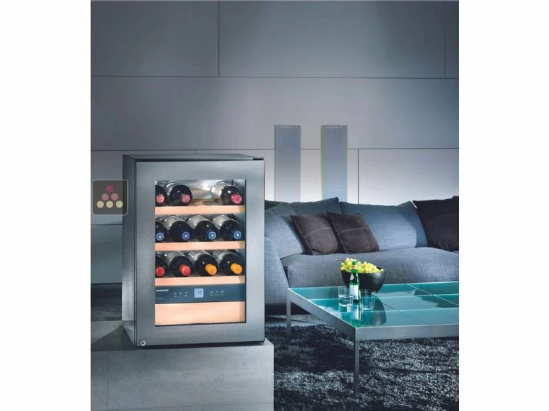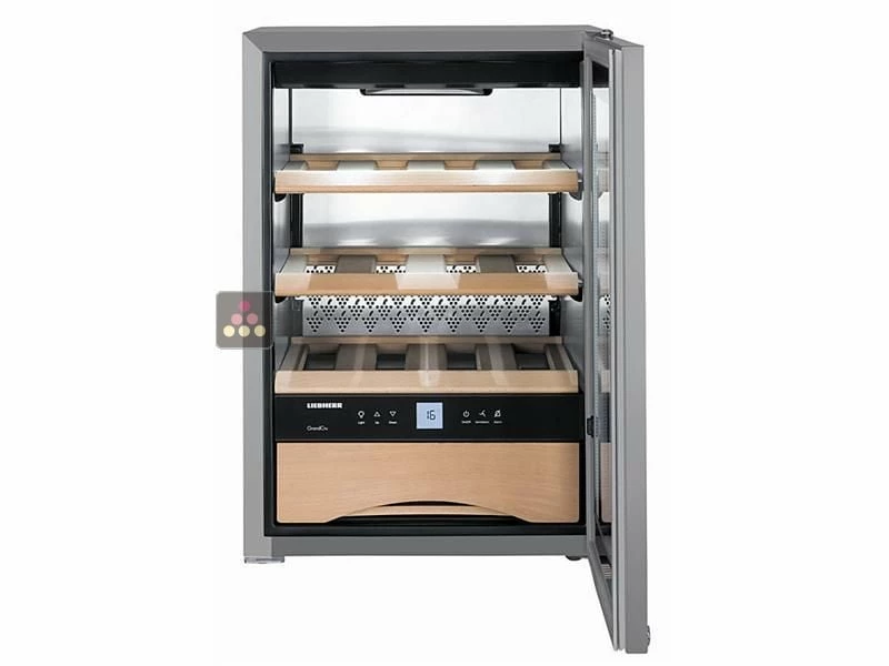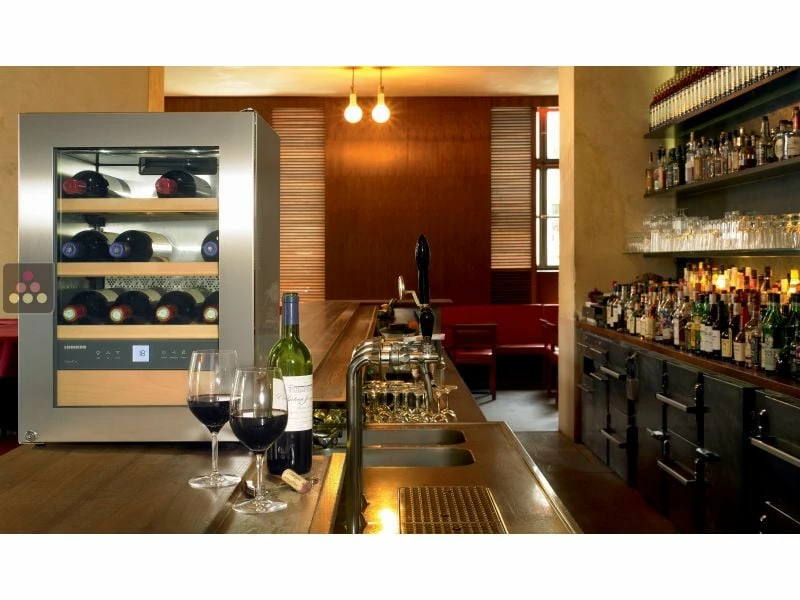 Cave à vin Mono-Température de conservation ou de service de petite capacité. Cette version est équipée d’une porte double vitrage teintée anti-UV réversible.