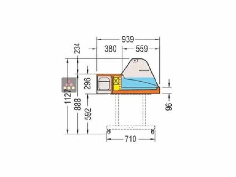 Comptoir réfrigéré à froid positif statique réglable entre +2° et +4°C. Cette vitrine est réfrigérée par un groupe froid intégré et diffusé de manière statique, avec un système de dégivrage entièrement automatique.