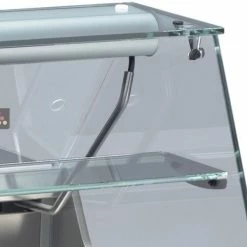 Côté service, les produits sont accessibles par des panneaux coulissants. Côté client, les produits sont présentés derrière un vitrage galbé (relevable pour le nettoyage).